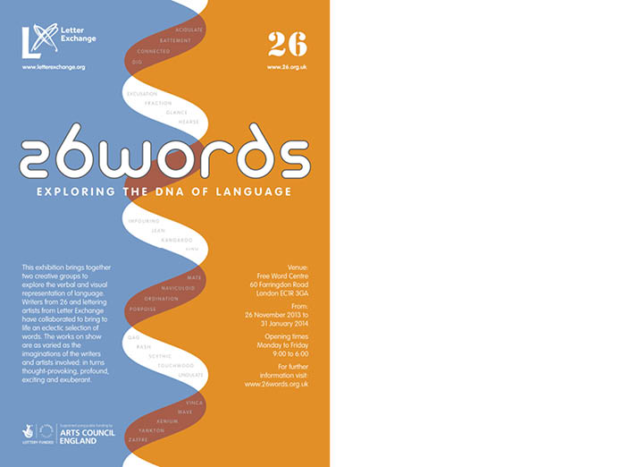 The 26 Words exhibition is a collaboration between Letter Exchange, the organisation for professionals in the lettering arts, and writers’ group 26. Writers and letterers were paired up at random and allocated a word, again at random, from each letter of the alphabet.