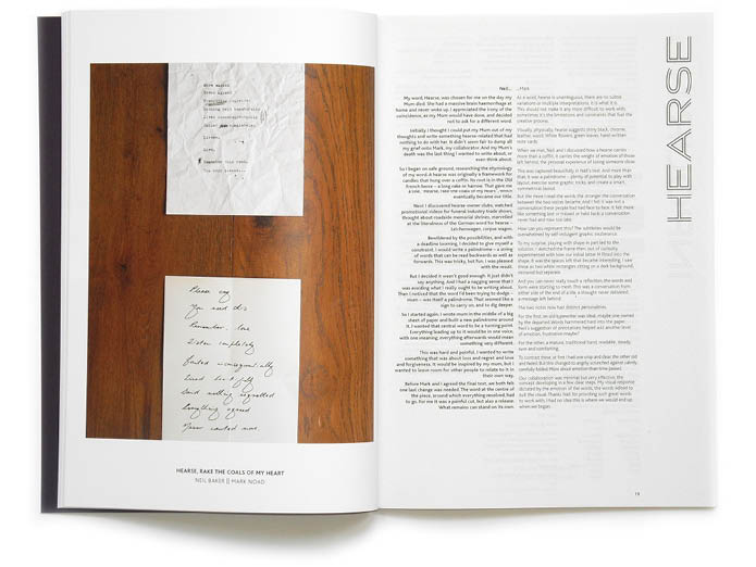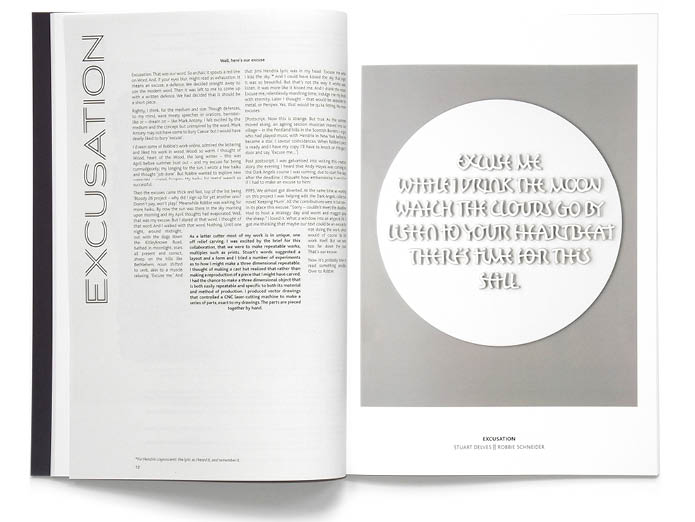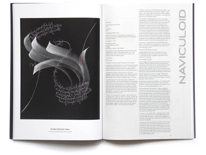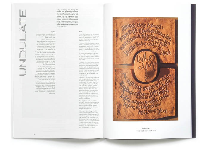 The catalogue contains images of all the works alongside the ‘creation stories’ of each of the pairings. The images needed to be reproduced beautifully which meant they should be printed on good quality, coated stock. However, this meant that the whole thing was going to be too expensive. To save money, I printed the accompanying texts in black only on thin uncoated stock interleaved between the coated pages. This brought it within budget and added interest to the flow of the book.