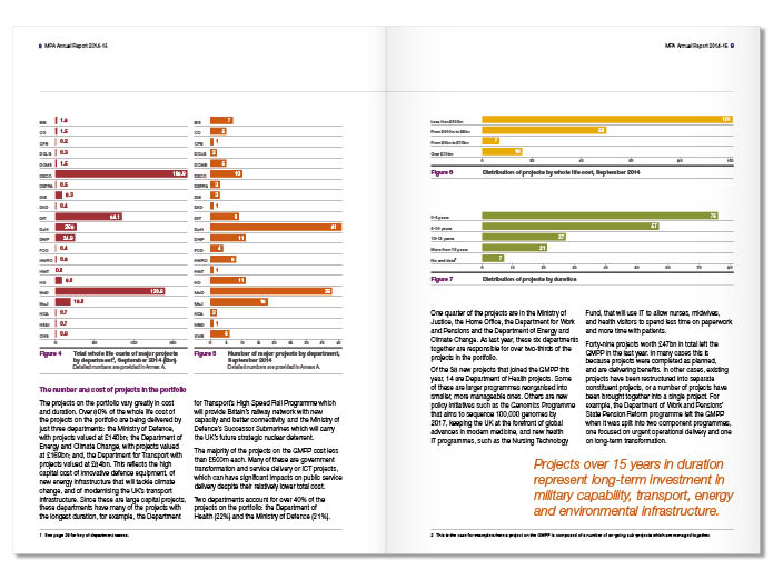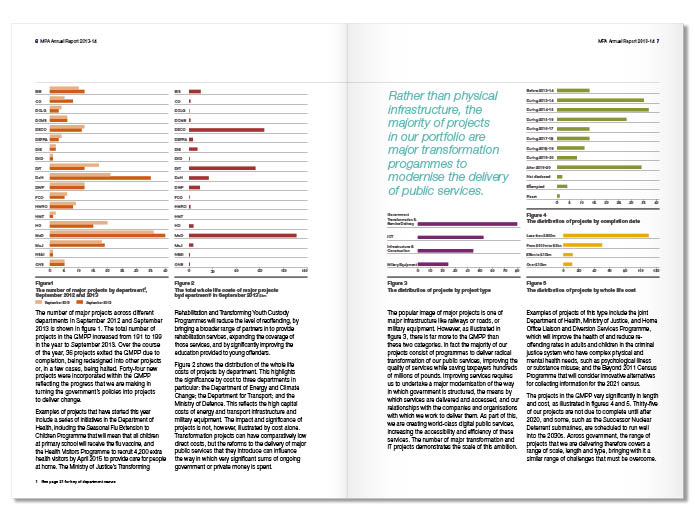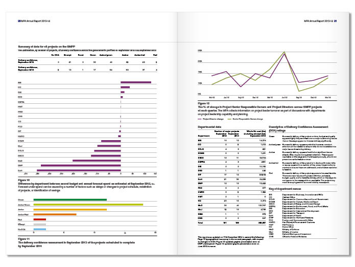 This is a very data-heavy report so the main task was to make the graphs and charts clear and allow the reader to easily compare the number and relative progress of projects across departments.