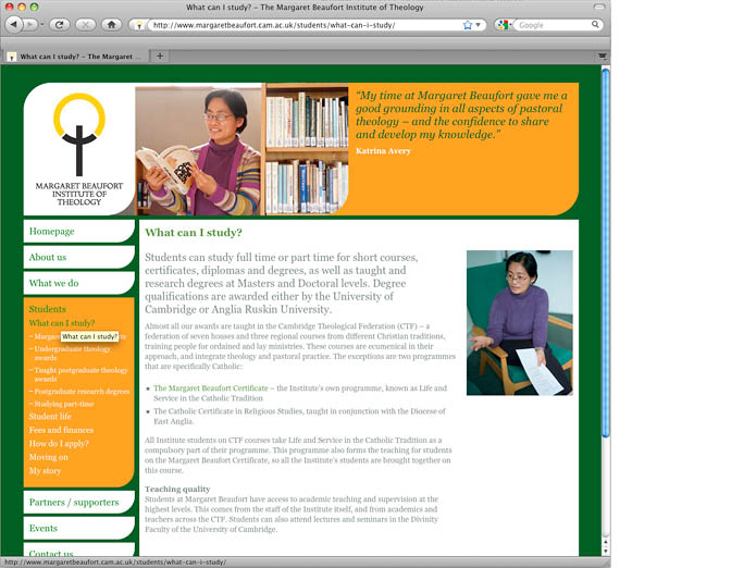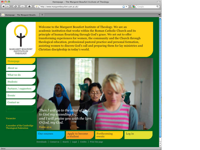 The Margaret Beaufort Institute of Theology is a Catholic Women’s College affiliated to the University of Cambridge. They first approached me to redevelop their website but it soon became clear that their existing identity did not work well in the on-line environment. As the brief for the website was to make it accessible and contemporary, I persuaded them that their identity needed to meet these requirements as well.