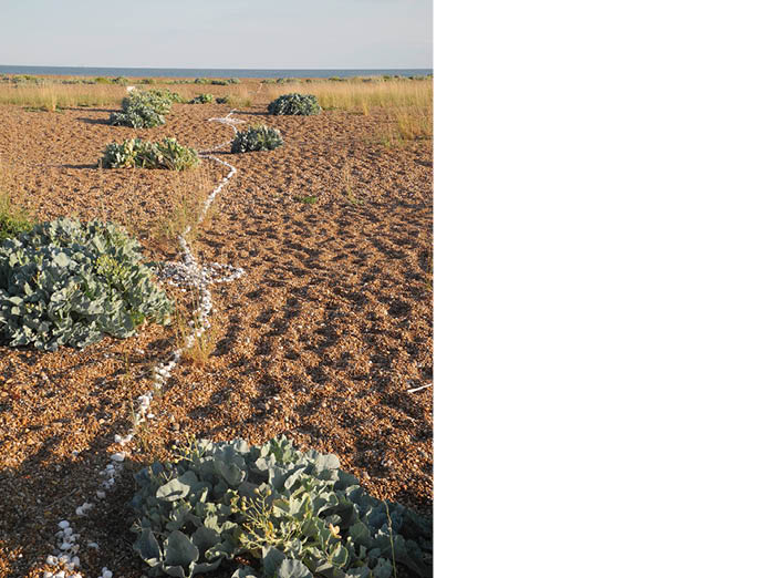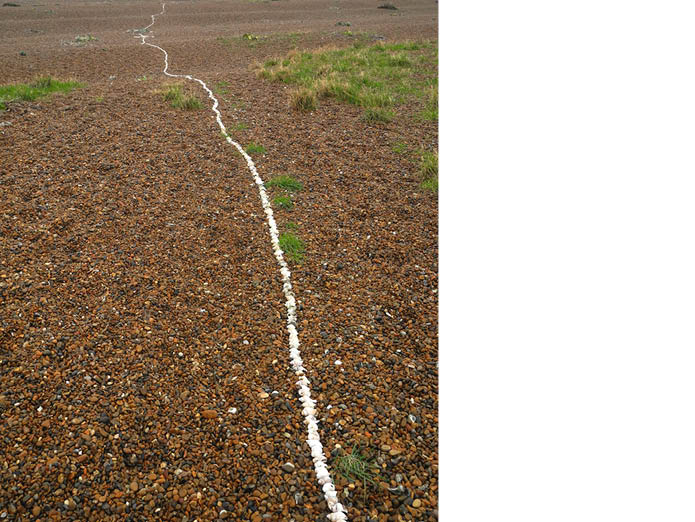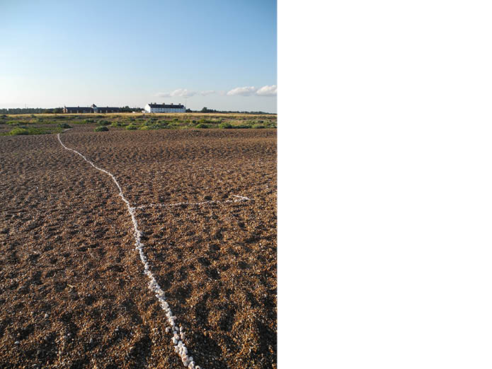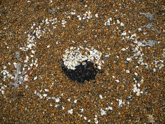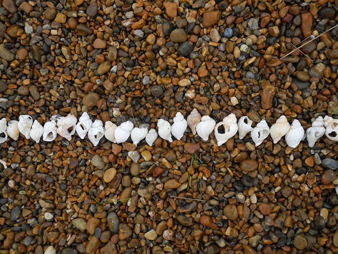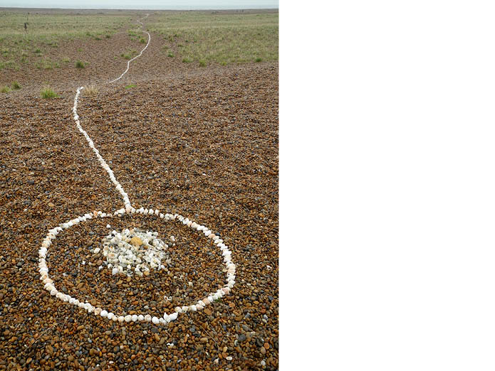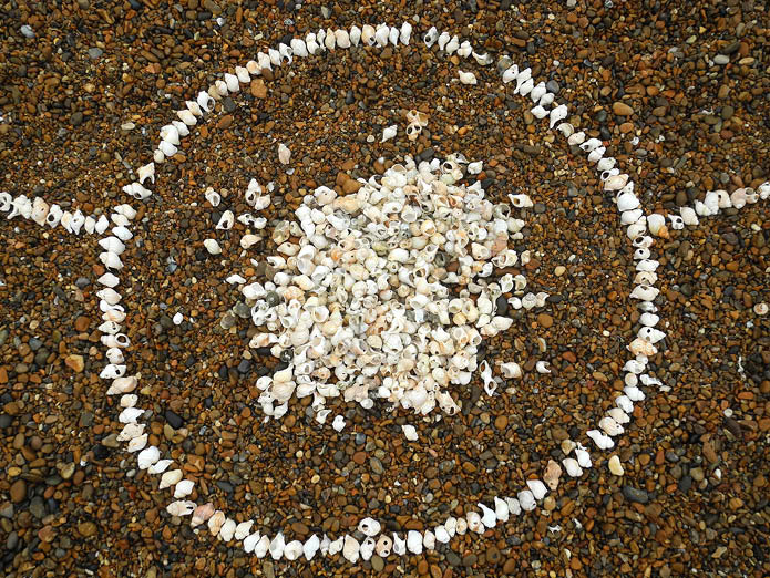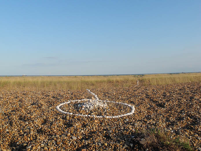 I first visited on a dull, overcast autumn day with a heavy air that left everything damp. As I strode across the shingle, I came across a circle of while shells, stark against the dark pebbles. From it led a line of more shells heading into the distance.