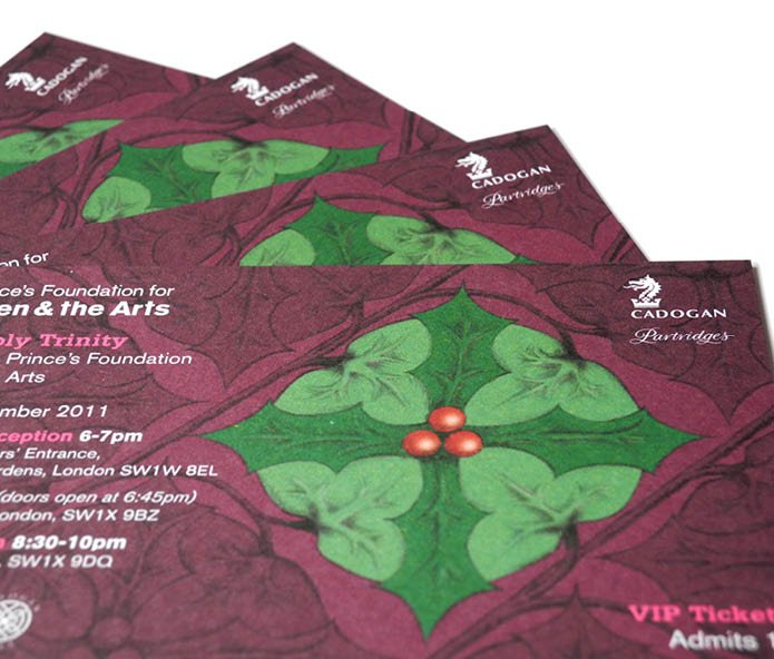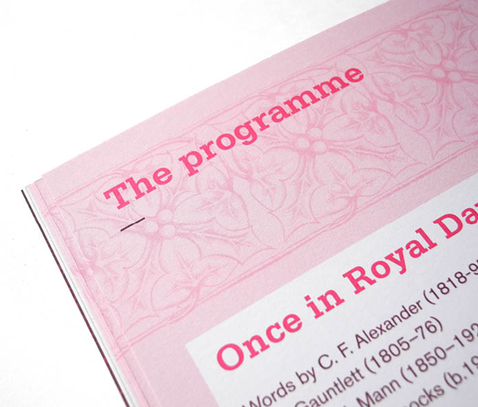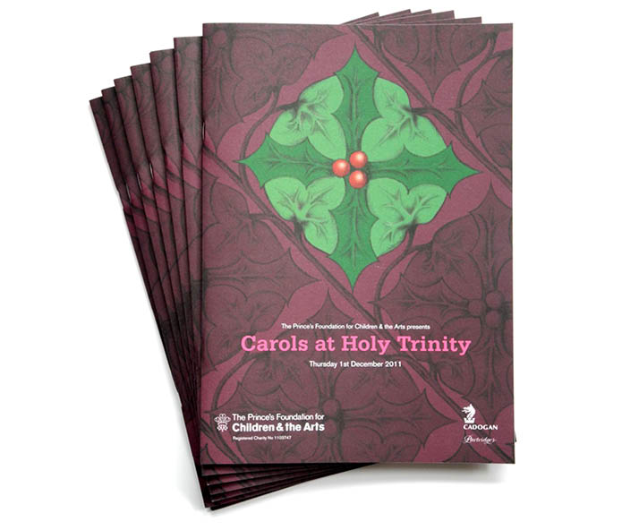 I used this as the inspiration for the visual theme creating a pastiche William Morris pattern using holly and ivy. This was applied to the programme, promotional banners, posters and the tickets.