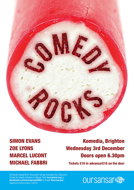 A poster for a charity fund raising comedy event in Brighton. The obvious link to Brighton Rock was too good to miss and resulted in a very powerful, eye-catching design.