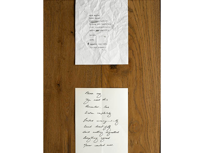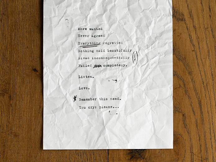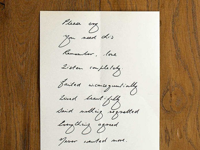 And you can never really touch a reflection, the words and form were starting to mesh. This was a conversation from either side of the end of a life, a thought never delivered, a message left behind.