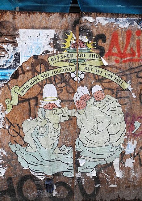 Digging a little deeper the artwork turns out to be a pastiche of Caravaggio’s The Incredulity of Saint Thomas by street artist deliciou$brains. You can see more work by him/her/them here: