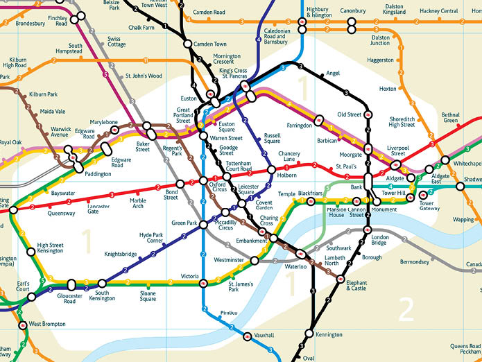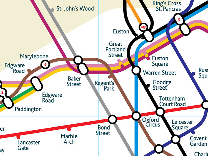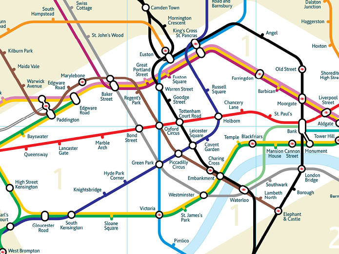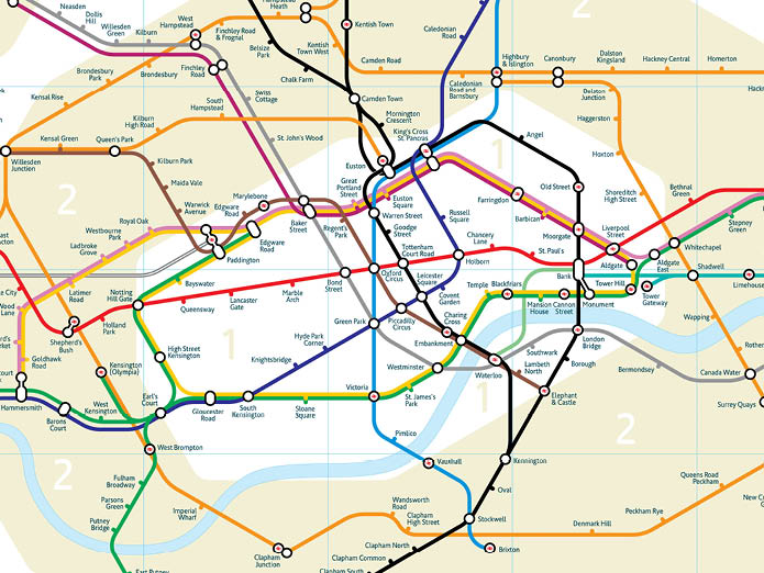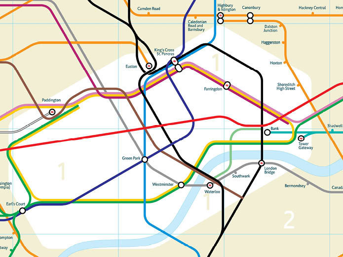 A truly geographic representation of the London Underground system is not practical to use as a navigation tool. The system covers a huge area but the majority of stations and the most important interchanges are located in a small central area. To be successful, the new version needed to reflect the geographic relationships of the stations to each other and to London as a whole but also be easy to read and usable to plan journeys.