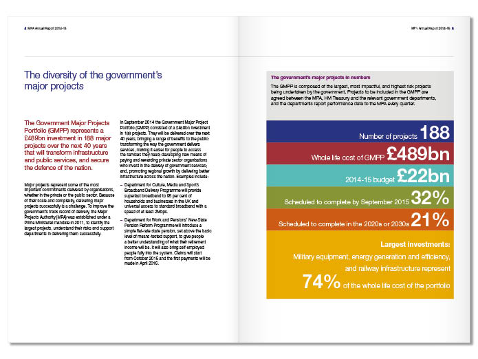 This is a very data-heavy report so the main task was to make the graphs and charts clear and allow the reader to easily compare the number and relative progress of projects across departments.