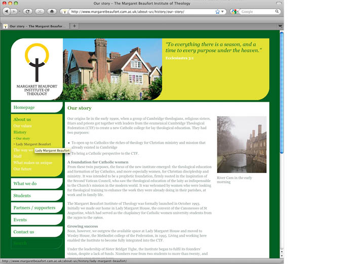 The Margaret Beaufort Institute of Theology is a Catholic Women’s College affiliated to the University of Cambridge. They first approached me to redevelop their website but it soon became clear that their existing identity did not work well in the on-line environment. As the brief for the website was to make it accessible and contemporary, I persuaded them that their identity needed to meet these requirements as well.