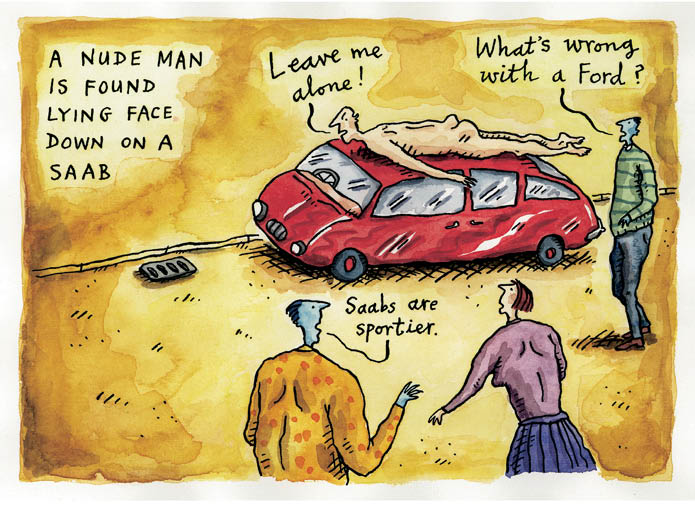 A nude man found lying face down on a Saab – an idea that came to Steven on the way to buy some milk from the corner shop – is strangely believable, particularly the trite comments of the onlookers. This was typical of many of the cartoons he showed us, wry, sideways views of the (almost) everyday.