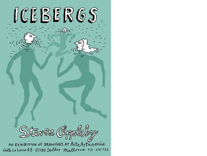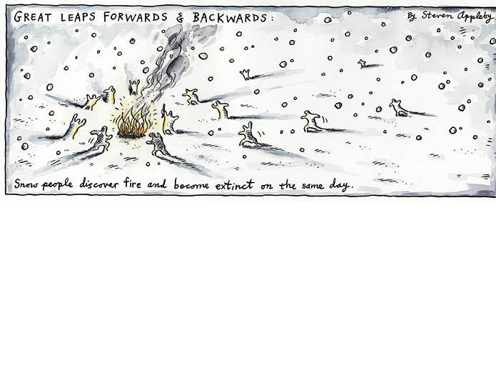 Ideas come to Steven primarily as words and phrases that he then illustrates. The accompanying text in his familiar ‘shaky’ handwriting is an integral part of the work as with Snow people discover fire and become extinct on the same day. In one example from a cartoon strip in the German newspaper Frankfurter Allgemeine Zeitung, it was easy to see where a German translator’s lettering had been used, the cartoon had lost an integral part of its character.